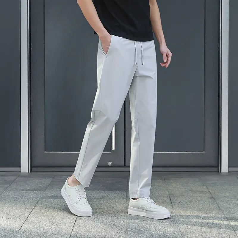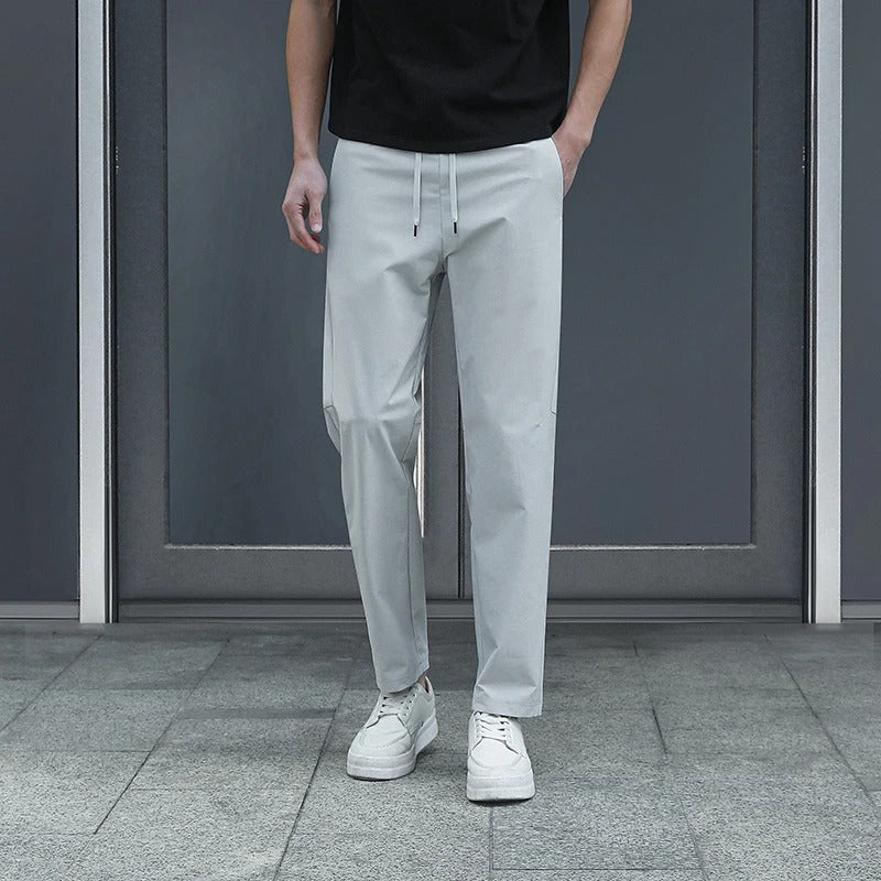 These straight-leg trousers have a pull-on elasticated waist with a lace tie for adjustment without a belt. Two side pockets add practicality, and the material suits warmer or mild days. Ideal for casual outings or relaxed occasions.